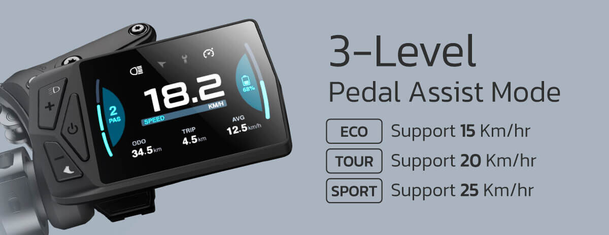 Display : ระดับแบตเตอรี่, ความเร็ว, โหมดช่วยปั่น